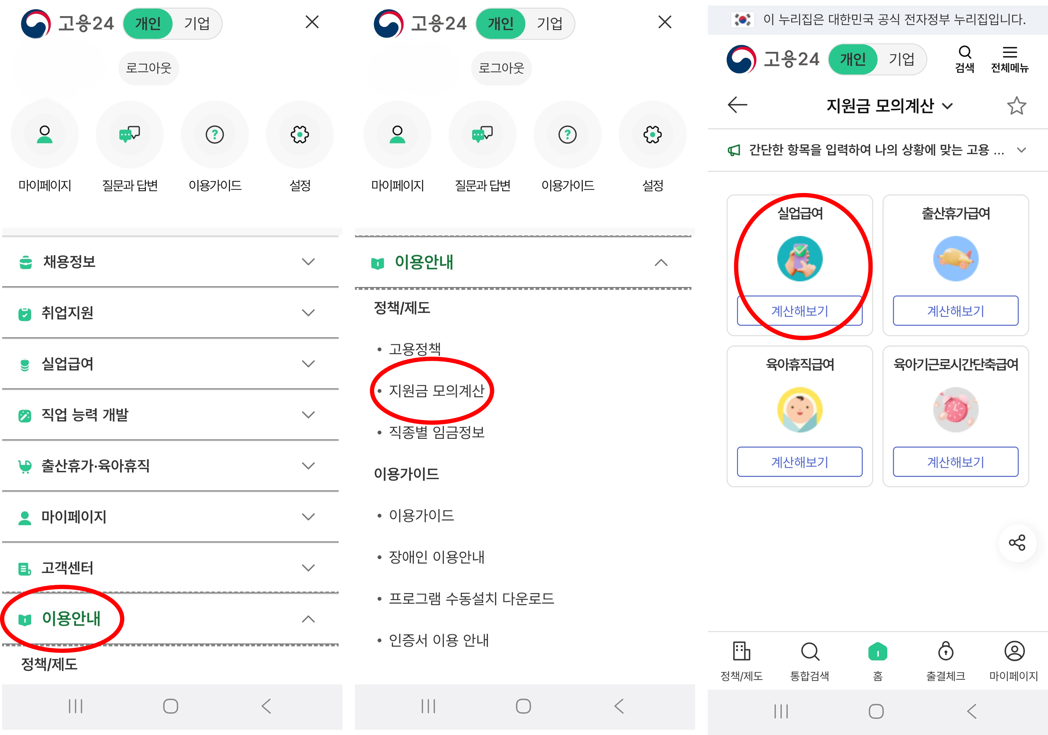 - 핸드폰 : 전체메뉴-이용안내-지원금 모의계산-실업급여 계산
